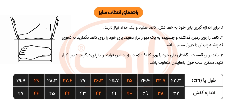 برای انتخاب سایز مناسب، توصیه می‌شود اندازه کف پای خود را از پاشنه تا نوک انگشت بزرگ اندازه‌گیری کنید