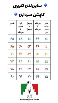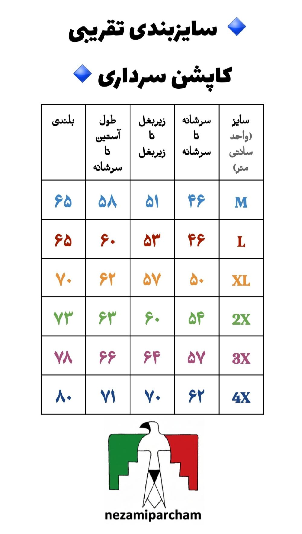 جدول سایز تقریبی میباشد و بدلیل تولید کالا در زمانهای مختلف امکان خطا تا ۱۰ سانت وجود دارد.